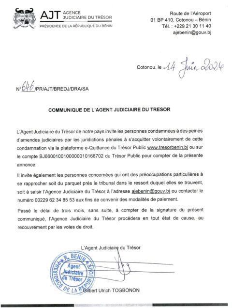Politique & Société Communiqué de l’Agent judiciaire du Trésor : Appel à l’acquittement volontaire des peines d’amendes judiciaires L'Agent Judiciaire du Trésor adresse un appel pressant à toutes les personnes ayant été condamnées à des peines d'amendes judiciaires par les juridictions pénales. Il les invite cordialement à s'acquitter La RédactionIl y a 1 anIl y a 1 anLire l'article