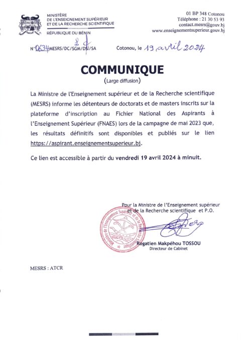 Politique & Société Les résultats définitifs du Fichier National des Aspirants à l’Enseignement Supérieur (FNAES) désormais consultables en ligne. Dans une annonce récente, le Ministère de l'Enseignement Supérieur et de la Recherche scientifique (MESRS) a informé les détenteurs de doctorats et de masters inscrits sur la plateforme d'inscription au La RédactionIl y a 2 ansIl y a 2 ansLire l'article