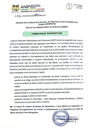 Du 06 au 26 mai 2024, l’Agence nationale d’identification des personnes (ANIP) conduit dans toutes les mairies et dans les arrondissements des communes à statut particulier, une opération d’enregistrement de décès de personnes ayant participé au RAVIP et pour qui, aucun acte de décès sécurisé n’a été établi après le décès. Cet enregistrement concerne les décès survenus entre le 1 er novembre 2017 et avril 2024 et qui n’ont pas été signalé. La déclaration nécessite une liste de pièces consultables dans le communiqué ci-dessous.