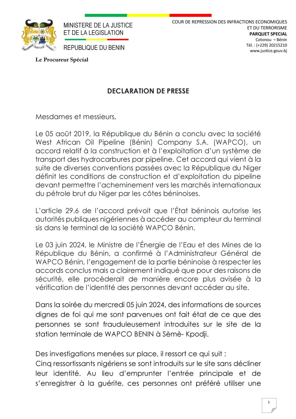 Le 03 juin 2024, le Ministre de l’Énergie de l’Eau et des Mines de la République du Bénin, a confirmé à l’Administrateur Général deWAPCO Bénin, l’engagement de la partie béninoise à respecter les accords conclus mais a clairement indiqué que pour des raisons de sécurité, elle procèderait de manière encore plus avisée à la vérification de l’identité des personnes devant accéder au site. Dans la soirée du mercredi 05 juin 2024, des informations de sources dignes de foi qui me sont parvenues ont fait état de ce que des personnes se sont frauduleusement introduites sur le site de la station terminale de WAPCO BENIN à Sèmè- Kpodji.