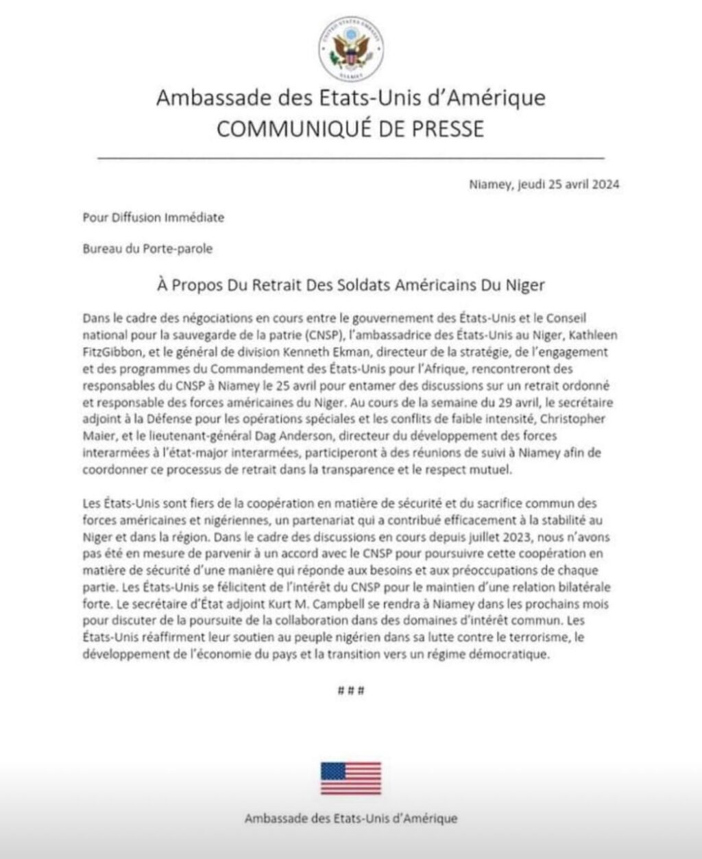 AccueilPolitique & SociétéL’ambassade des États-Unis au Niger communique au sujet du retrait des soldats américains du Niger.Politique & Société L’ambassade des États-Unis au Niger communique au sujet du retrait des soldats américains du Niger. La RédactionIl y a 2 ansIl y a 2 ans448,0 Lectures0 Commentaires Lire le communiqué Mots-clés:#Ambassade#États-Unis#NigerDiplomatie Partager : PrécédentAya Nakamura, la reine incontestée des Flammes 2024 – Les Victoires du rapSuivantSuspension de la BBC et de Voice of America au Burkina Faso Articles Similaires Politique & Société Arrestation d’une journaliste italienne en Iran : Le gouvernement romain s’implique La RédactionIl y a 11 mois Politique & Société Ouverture du procès d’Oswald Homeky et Olivier Boko pour tentative de coup d’État au Bénin La RédactionIl y a 11 mois Politique & Société Publicité mensongère sur des produits pharmaceutiques : la HAAC met en garde les médias La RédactionIl y a 5 mois Politique & Société 65e Anniversaire de l’indépendance : L’opposition togolaise contraint de reporter son meeting La RédactionIl y a 7 mois Politique & Société Macky Sall, Envoyé spécial du Pacte de Paris pour les Peuples et la Planète La RédactionIl y a 2 ans Laisser un commentaire Annuler la réponseVotre adresse e-mail ne sera pas publiée. Les champs obligatoires sont indiqués avec * Enregistrer mon nom, mon e-mail et mon site dans le navigateur pour mon prochain commentaire.
