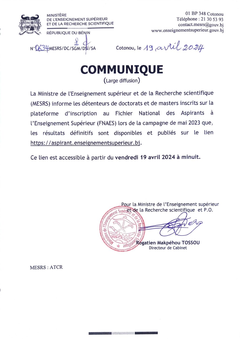Le Ministère de l’Enseignement Supérieur et de la Recherche scientifique (MESRS) félicite tous les candidats ayant réussi leur doctorat ou leur master et encourage ceux qui n’ont pas obtenu les résultats escomptés à ne pas se décourager. Il tient à rappeler que les opportunités sont multiples dans le domaine de la recherche et de l’enseignement supérieur.