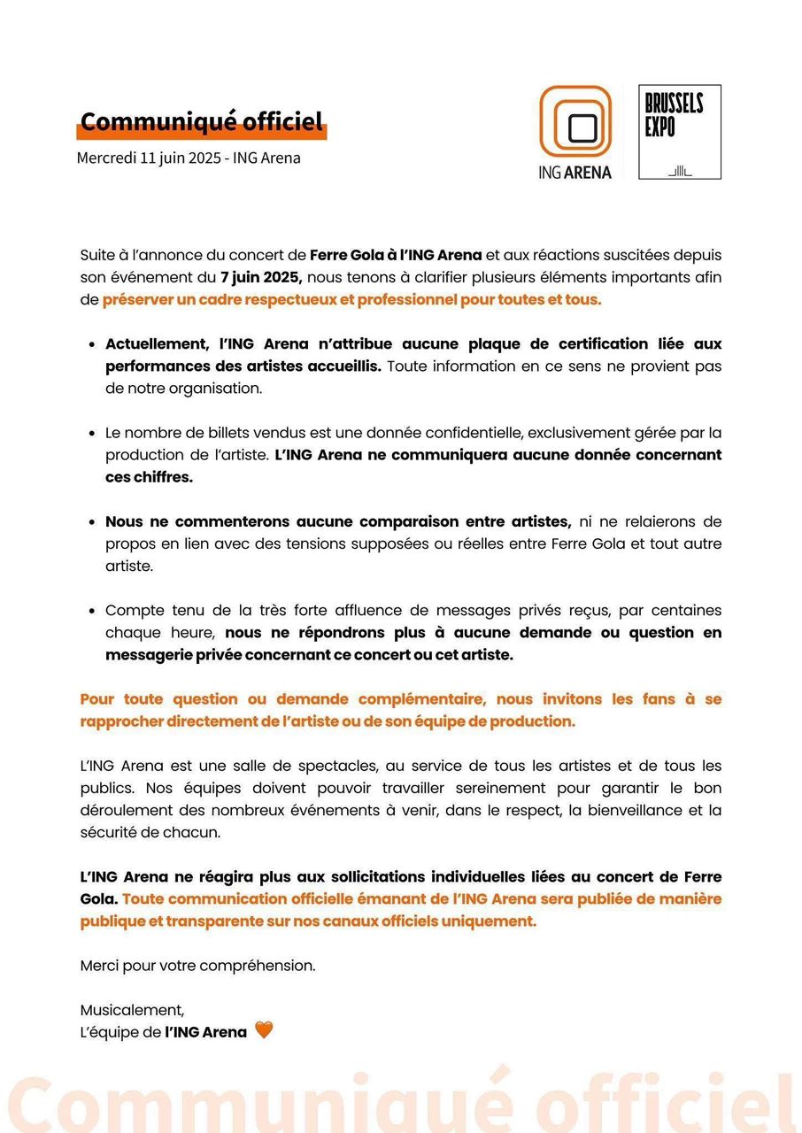 L’ING Arena a publié un communiqué officiel ce mercredi pour répondre à la vague de réactions et de spéculations entourant le concert de l’artiste congolais Ferre Gola, tenu le 7 juin dernier dans la prestigieuse salle bruxelloise.